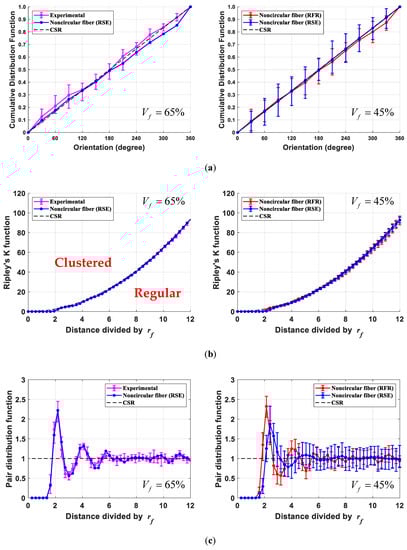 Nearest neighbor orientation is a cumulative distribution function for the orientation angle of the line between each fiber and its nearest fiber [24]. Figure 5a shows the nearest neighbor orientation of experimental data, RFR, RSE, and CSR, according to = 65% and 45%. To compute the mean value () and error bar of the nearest neighbor orientation according to the angle, 10 experimental samples with = 65% and 100 RVE samples with = 45% for each case of RFR and RSE were prepared (note that for = 65%, one master RVE with noncircular fibers was used). The results show that the nearest neighbor orientation of experimental data, RFR, and RSE is close to the CSR pattern. Furthermore, the RSE results are closer to experimental data and CSR than those of RFR. This finding is consistent for the case of circular fibers as reported in other works [23,24].