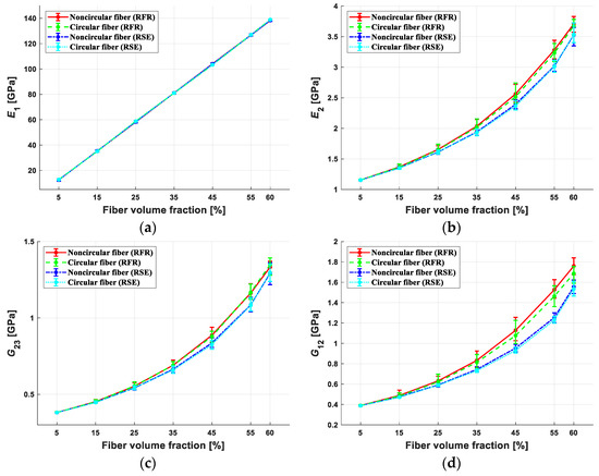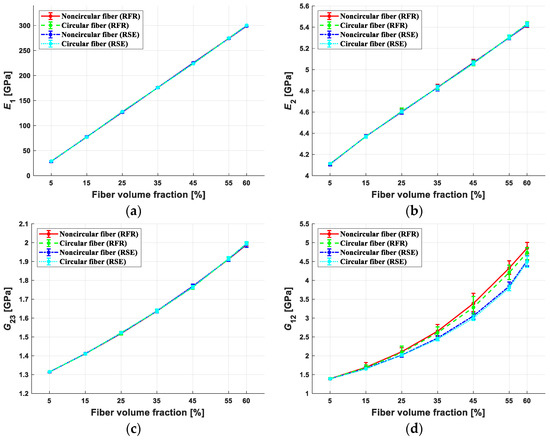 Additionally, it should be noted that, in the case of M55J/M18, the deviations of the transverse moduli , are minimal regardless of the fiber shape and the algorithm of random RVEs. However, the other transverse modulus varies according to the fiber shape and the algorithm of random RVEs. In the case of T300/PR319, all transverse modulus , , and show large deviations according to the RFR and RSE algorithms, and as increases, the deviation increases. For example, for = 60% with the RFR algorithm, the deviation of according to fiber shape is 4.33%, which is larger than that of M55J/M18 (=2.58%). As mentioned earlier, it could be because of the M55J/M18 composite is not significant compared to that of T300/PR319. Although the difference in the effective elastic properties according to the fiber shape of M55J/M18 is small, the actual noncircular fiber shapes should be considered because of the transverse tensile strength accompanying crack propagation. The reason is that, according to our previous work [18], it was reported that the result of the transverse crack propagation simulation showed a different crack pattern from the test result when the circular fibers were assumed instead of the actual fibers. In addition, as of the composite is larger, the deviation of , , and values of RFR are larger than those of RSE. This is because the minimum distance between the fibers of the RFR is closer than that of the RSE, as reported in [24].