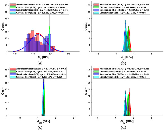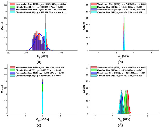 Figure 7 and Figure 8 show the effective elastic properties (, , , ) according to from 5% to 60% of M55J/M18 and T300/PR319 by the computational homogenization, respectively. Figure 9 and Figure 10 show the histogram and normal distribution in terms of and of the effective elastic properties for = 60% of M55J/M18 and T300/PR319, respectively. Table 4 and Table 5 show the and relative error of the effective elastic properties for = 60%, 55%, and 45% of M55J/M18 and T300/PR319, respectively. From the results, it can be seen that both materials show little deviation in , but the deviation of RVE with noncircular fiber is greater than that of RVE with circular fibers as seen in Figure 9a and Figure 10a. This is because the deviation in of RVE with noncircular fiber is larger than that of RVE with circular fiber as discussed in Section 3.2.