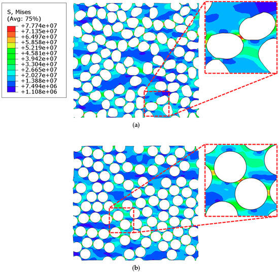 Von Mises stress with 1% tensile strain for = 60% of T300/PR319: (a) RVEs with noncircular fibers and (b) RVEs with circular fibers.