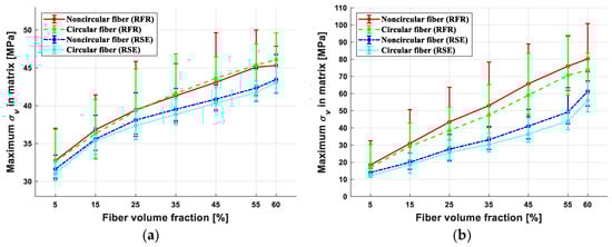 In addition, as increases (i.e., T300/PR319), the RVE composed of noncircular fibers tends to a larger maximum von Mises stress in the matrix and wider deviation than the RVEs composed of circular fibers. In the case of T300/PR319 with = 60%, the deviations of RFR and RSE according to fiber shape are 8.83%, 9.68%, respectively. Furthermore, it can be seen that the maximum deviation is 12.69% when = 45% with the RSE algorithm in T300/PR319. However, in the case of M55J/M18 with a lower , the maximum deviation of von Mises stress is quite minimal, less than 2%. Thus, it is concluded that the effect of shape on the maximum stress is critical as the is larger.