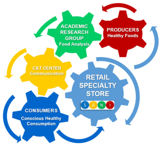 To achieve this, the SANI strategy required the coordination of various activities―ranging from the agricultural sphere to the scientific and marketing spheres―that result from the knowledge and skills of the SANI partners (represented as a series of gears in Figure 2), which were as follows: (1) producers (local farmers); (2) academic research groups (universities) focused on food analysis, lifecycle assessment (LCA), and with expertise in the study of nutritional molecules [27,28,29,30]; (3) a consulting and training center (C&T Center, a local society) specialized in organizing training in communication, marketing, and professional updating courses; and (4) a local retail specialty store located in an Italian medium-sized urban area (population 200,000–500,000), which played the role of the principal investigator of the funded SANI project.