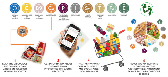 As shown in Figure 3, the SANI labels consisted of specific colorful marks that were assigned to each healthy nutritional component. Interestingly, these labels were equipped with a QR code, intended to be useful to consumers by allowing them to access real-time information in order to enrich their shopping carts with many healthy products, making it possible to achieve a balanced, healthy, complete, and sustainable diet.