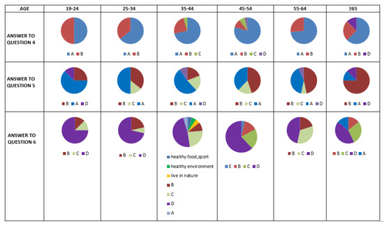 Distribution of responses to the SANI survey questionnaire by age group. Question 4: What do you think about natural products? Question 5: What does natural food mean to you? Question 6: What would you do to live in wellness? Refer to Table 2 for the answers.