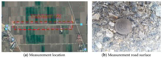 CPB and A-CPX were conducted on a common cement road, Dangssang Road, Gunsan, Korea. The experimental track of CPB and the A-CPX method was a straight road section at least 1.2 m away from large objects on the side of the road. Figure 1 shows the measurement location and road surface of the CPB and the A-CPX methods.
