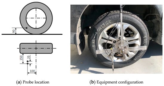 Before the experiment, we closed the trunk lid, skylight, all windows, and ventilation devices for air intake and exhaust. There were no other sundries in the vehicle except for the experimental personnel and equipment. Before the series of experimental runs, the vehicle was driven for 15 min to warm up the tires. During each experiment, the driving direction of the vehicle was consistent and the experimental section was fixed to maintain the reliability of the experiment [].