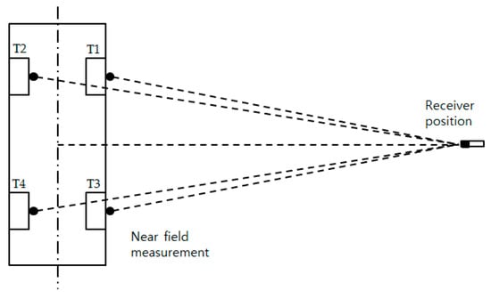 Because the A-CPX method is a near-field experiment and the CPB method is a far-field experiment, the process of predicting far-field noise from near-field noise is essentially an extrapolation process []. The physical configuration of near-field noise extrapolated to far-field noise is shown in Figure 4 []. To discuss the transmission relationship between near-field noise and far-field noise and to simplify the theoretical derivation of the extrapolation process, we assumed that the statistical characteristics of the four tires’ sources were consistent and all of them were incoherent noise. We also assumed that the contributions of the front and rear tires of the vehicle to the far-field sound pressure measurement were the same.