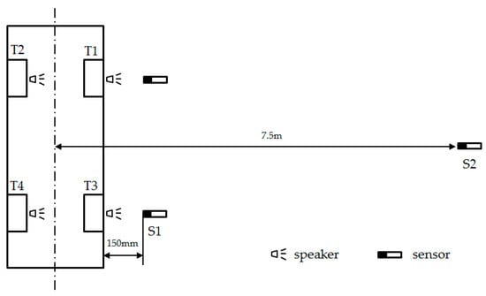 According to the same assumption above, the relationship between the noise experiment results of the two methods was determined using tire noise lateral transfer experiments in the semi-free field. The layout of the measuring points in the experimental sound field is shown in Figure 5 []. The layout of measuring points in both the A-CPX and CPB methods was considered []: S1 was the corresponding measuring point for A-CPX and S2 was the corresponding point for CPB.