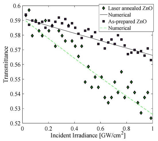 The nonlinear optical absorption behavior of a material can be observed through the observation of the optical transmittance as a function of the optical intensity irradiating a sample. We determined the ablation threshold of the sample by a single pulse with fluence 4 J/cm2. From Figure 1 can be noticed that a monotonic flat trace demonstrates the fingerprint of a two-photon absorption exhibited by the samples. The fitting by Equation (4) was made considering a nonlinear optical absorption coefficient β = 4.4 × 10−9 m/W. We noticed that the irradiation of a single pulse 10% below the ablation threshold of the sample gives origin to a fitted β = 11.9 × 10−9 m/W as can be seen in Figure 1, but no changes in Leff were observed.