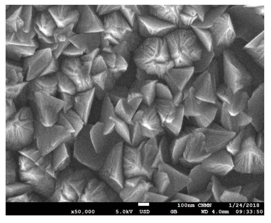 The modulation in the third-order nonlinear optical effects in the laser annealed ZnO nanostructures was obtained with no observation of changes in optical absorption nor in their morphology. Microscopy evidences for the nanostructured morphology exhibited by the ZnO thin solid film samples are shown in Figure 3. Statistical measurements indicate that the grain size corresponds to particles with a distribution from 100 to 500 nm. The pyramidal shape of the columnar nanostructures seems to be a signature for the defects and dislocation in these nanostructures [].