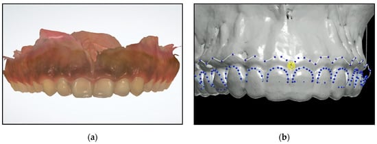 (a) Intraoral scan of the maxillary jaw; (b) After superimposition of the CBCT and the intraoral scan, the cementoenamel junction and future bone level marked.