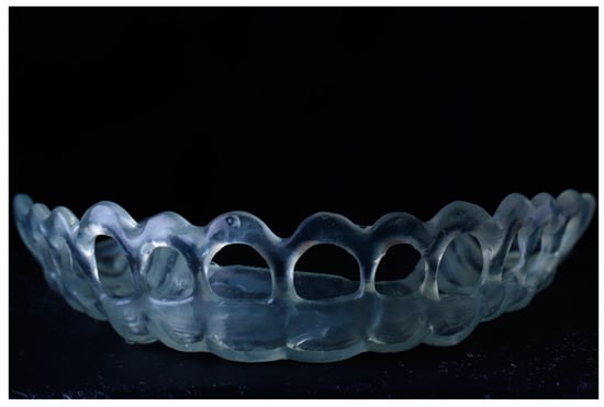 Data was transferred to a three-dimensional printer (Formlabs II; Formlabs Inc., Somerville, MD, USA). The printer used utilizes stereolithography (SLA) technology with Laser Spot size of 140 microns and layer thickness of 25–300 microns. The guide was printed (Figure 4) and then checked to ensure it fits in the mouth of the patient prior to starting the surgery.