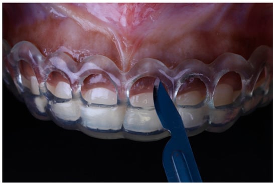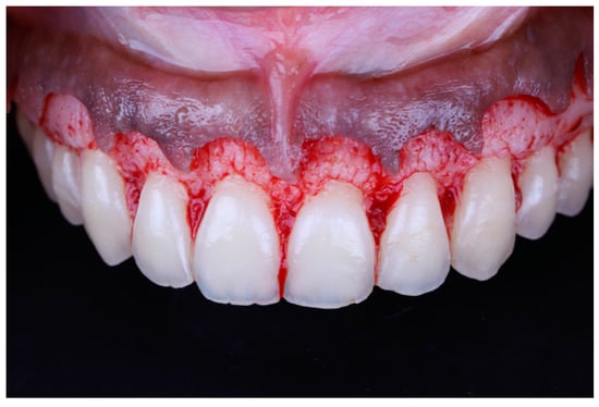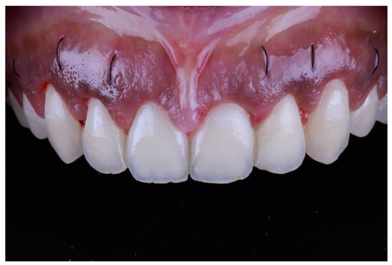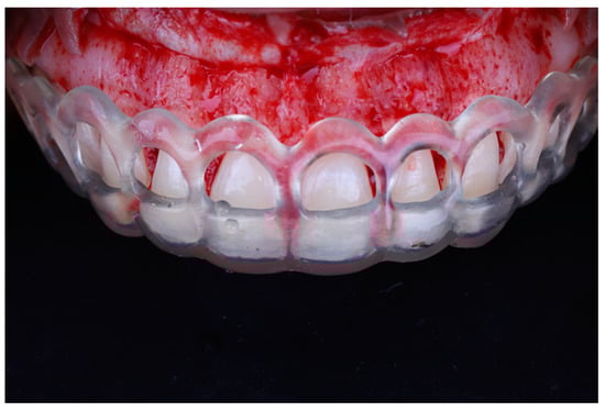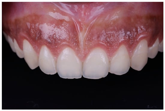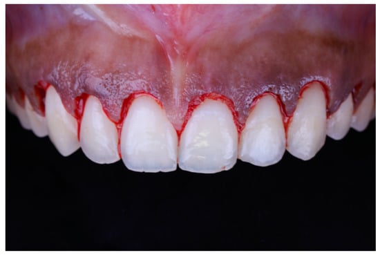 To achieve adequate esthetic results, surgical guides are often utilized, and based on diagnostic waxing, made with acrylic resin or vaccuform transparent shells [,]. However, this technique has been reported to be sometimes inaccurate []. A recent report described a digital workflow in which digital waxing was used to design the surgical guide for crown lengthening []. The use of diagnostic waxing is not necessary when no restorative treatment is indicated.
