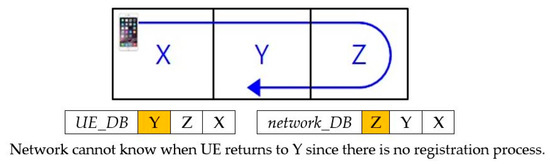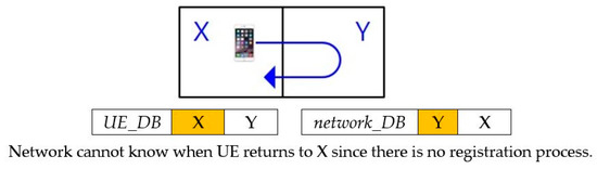 Location registration is divided into two main categories [9,10,11]. The first category is if the UE moves to a new zone that is not a previously stored zone, then it registers the location. The second category is if a call occurs from/to the UE in the current zone, the network updates the location. In the case of the first category, a location registration message is actually sent to the network. In the case of the second category, a separate location registration message is not delivered to the network, but the network can infer the UE’s zone through the call processing messages. The first category is referred to as regular registration (RR) and the second category is referred to as implicit registration (IR).