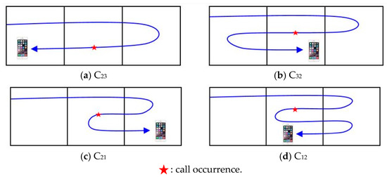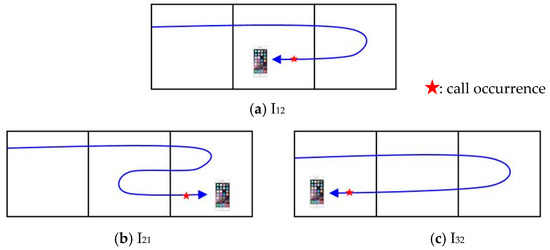It is necessary to note that the sojourn time of state Iij (i = 1, 2, 3; j = 1, 2, 3) is different from the sojourn time of state Eij (i = 1, 2, 3; j = 1, 2, 3) or state Cij (i = 1, 2, 3; j = 1, 2, 3). The sojourn time of state Eij (i = 1, 2, 3; j = 1, 2, 3) or state Cij (i = 1, 2, 3; j = 1, 2, 3) is the interval from the time a UE enters a zone until the time it leaves. On the other hand, the sojourn time of state Iij (i = 1, 2, 3; j = 1, 2, 3) is the interval from the time a call to/from a UE occurs in a zone, until the time it leaves.