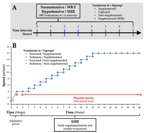 Scheme of interventions. Part (A): Evaluations of SBP in normotensive (WKY) and hypertensive (SHR) rats. WKY were randomly allocated into three groups, and an additional group of SHR was evaluated. All treatments were administered by gavage. Part (B): Evaluations of SBP in SHR. SHR were randomly allocated into four groups. Supplementations were carried out by gavage. Physical activity time period and intensity were gradually increased from 5 to 60 min and from 1 to 16 m/min, respectively. SBP: systolic blood pressure. WKY: Wistar Kyoto rats; SHR: spontaneously hypertensive rats.