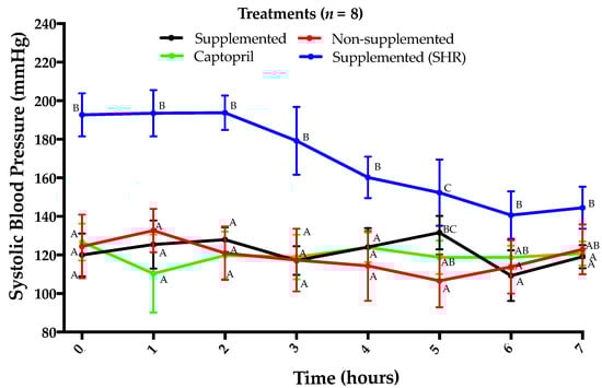 Normotensive Wistar Kyoto rats (n = 24) were randomly allocated into three groups: supplemented with amaranth hydrolysate (1.2 g/kg body weight) [4], a captopril control group (solubilized in water; 25 mg/kg body weight) [16,17,18], and water only (non-supplemented). An additional group of supplemented SHR (n = 8) was used for comparison purposes (Figure 1A). Orogastric feeding tubes were used for treatment administration (18GA_75 mm, Instech Laboratories, Inc., Plymouth meeting, PA, USA). SBP measurements were carried out by the tail-cuff method (CODA tail cuff, Kent Scientific, Torrington, CT, USA). The SBP evaluations were carried out before (time 0) and after supplementation at 1 h intervals for 7 h (Figure 1A).
