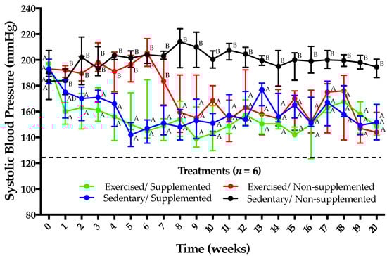 The exercised/non-supplemented group started lowering their SBP at week seven of the intervention (8.5 mmHg, average; p > 0.05 vs sedentary/non-supplemented). At week eight, the SBP recorded showed an additional positive reduction (31.5 mmHg, average; p < 0.05 vs sedentary/non-supplemented, p > 0.05 vs exercised/supplemented and sedentary/supplemented) (Figure 3). The positive reduction in SBP was sustained until the end of the intervention (p < 0.05 vs sedentary/non-supplemented, p > 0.05 vs exercised/supplemented and sedentary/supplemented). The lowest positive reduction in SBP was recorded at week nineteen (52.0 mmHg, average) (Figure 3).