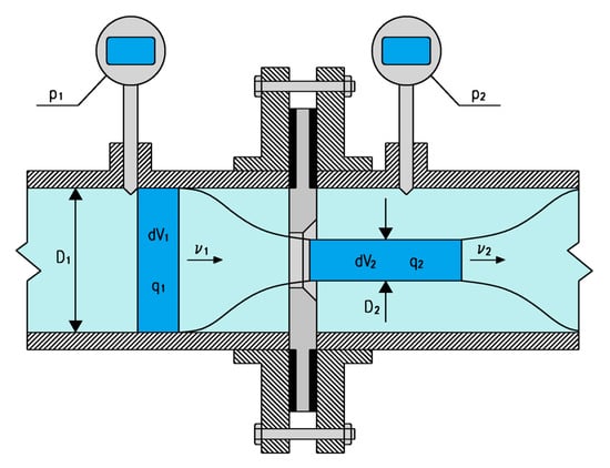 in which subscripts “1” and “2” mark the fluid situation before/upstream and after/downstream the shrinkage, respectively. In both cases, the fluid situation must be measured at a point at which the flow can be considered stationary.