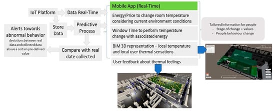 Predictions algorithms, using locally collected data, can be very important to change user behaviour, and taking into account that energy suppliers can result in a rough prediction of community energy needs for heating or cooling. Figure 1 illustrates our major work outputs and developed modules. The IoT platform developed in previous work [6] gives real-time data to people through a 3D interface and feeds the developed predictive process for the personalized forecast. The system is also used to generate alerts when it detects abnormal behaviours or consumptions.