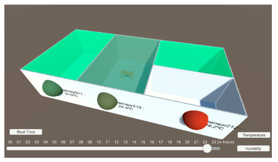 For visualization purposes, the model was imported to Unity and integrated with a local database where the sensor’s readings are stored. Each room’s temperature or humidity is displayed using colour gradient functions—with red for higher temperatures, green for lower temperatures, dark blue for higher humidity values, and light blue for lower humidity values. As example of this process is illustrated in the Figure 2.