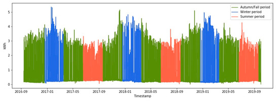 During the analysis of the data, it was identified that some data was not prepared for this work: (1) The end of a dataset always contained the first day of the next month, so the energy consumption in kWh of this record was always 0. (2) From 1 September 2016 to 13 September 2016 and from 6 April 2019 until 30 April 2019, there were no records of energy consumption. These anomalies were caused by faulty batteries that were powering the energy sensor. Any duplication in the datasets was removed, considering only the record that had the real value.