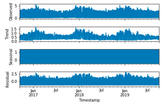 One of the important steps for posterior forecasting was to verify the overall view of the data in terms of stationarity and seasonality. The augmented Dickey–Fuller test was applied to confirm if the null hypothesis was rejected, or in other words, if the data was stationary. The p-value obtained was 0.00, meaning that the data was stationary, thus confirming that there was no need to transform the data in this regard.
