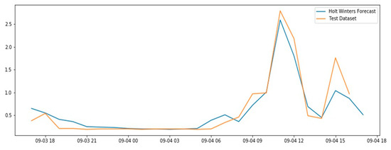 With the Holt–Winters as the model with the best accuracy values for 24-h forecasting, a visual comparison of the predictive values and the real values was done to analyse the quality of the predictions. As shown in Figure 6, the forecasted value and the real value in 24 h are very similar, thus leading us to identify that the Holt–Winters model is a suitable predictive model to be included in the proposed sensor-driven monitoring system with energy consumption through time.