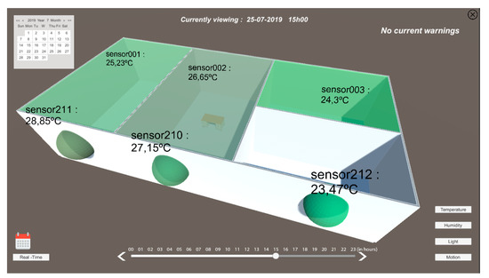 On the primary dashboard (Figure 6), users have different views for various factors—for example, temperature, moistness, movement, or light. Each perspective presents a warning when a warning event is identified with that variable. At the point when the temperatures mode is chosen (Figure 7), each room presents a colour identified with the current temperature. The system takes into account the defined temperature for the room and, using the prediction model, how much energy is required to reach it. If the current temperature is within comfortable limits and the AC is turned on, the system suggests the user turn it off, and presents the predicted energy cost for keeping the current temperature till closing hours for one week. This warning provides a medium-term estimative of a small action possible savings, considering the average energy consumption when the AC is on, and the average amount of time people use the room, together with the prediction model.