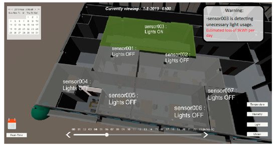 Another view mode of the dashboard is light and motion (Figure 8), in which it is possible to observe the current light level determined by the light sensor and which rooms have artificial light turned on. For example, in a situation that the natural light level is considered enough based on pre-defined values. If the system detects that artificial light has been turned, on it issues an alert to the 3D model warning about the unnecessary energy waste and how much it would cost to leave the lights on for the rest of the day for a week of repeating the same behaviour, using the average light consumption amount per room. This is also where people can identify warnings about rooms with artificial light turned on and no motion detected therein.