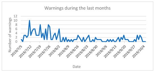 As illustrated in Figure 9, over time, the warning was significantly reduced due to our implemented approach where people interaction was achieved. People react before the system generate alerts. As the output of our approach, we can say that we give the user tools to have a real perception of the environment and take actions as an individual or as a group by understanding the overall room indicators and energy consumptions, leading to more conscious decisions and less energy waste.