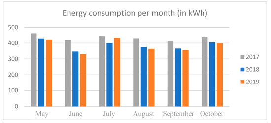 Figure 10 presents energy consumption for that building section for the research period and previous years. From the collected data, it is possible to determine an average energy consumption reduction of 11% compared with 2017 and 3% compared with 2018. The results compared with 2018 were less obvious because of the lack of frequent heat waves during that year, which prevented air conditioning from being used.