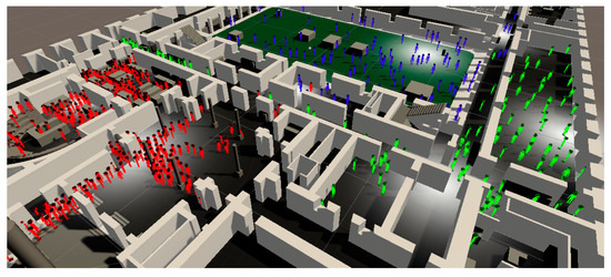 To improve user perception of each room’s conditions like temperature, it is possible based on an App previous installed by the users to collect their temperature feedback and check their presence using Wi-Fi probe requests [28]. This information can be represented in a 3D using BIM models using colouring avatars inside each room. People can evaluate their current thermal comfort and act according to their needs. The avatar’s colour is defined by compiling the average room evaluation provided by people with the mobile APP. Each user can evaluate the thermal comfort as ‘low temperature’—blue, ‘good temperature’—green, or ‘high temperature’—red, based on user collected feedback.