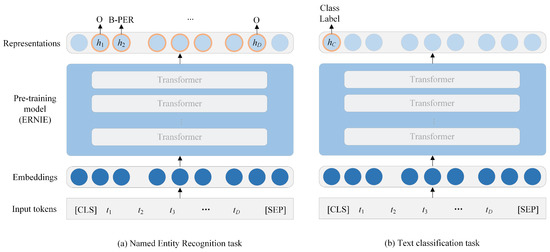 The illustration of fine-tuning Enhanced Representation through kNowledge IntEgration (ERNIE) on Named Entity Recognition (NER) and text classification tasks.