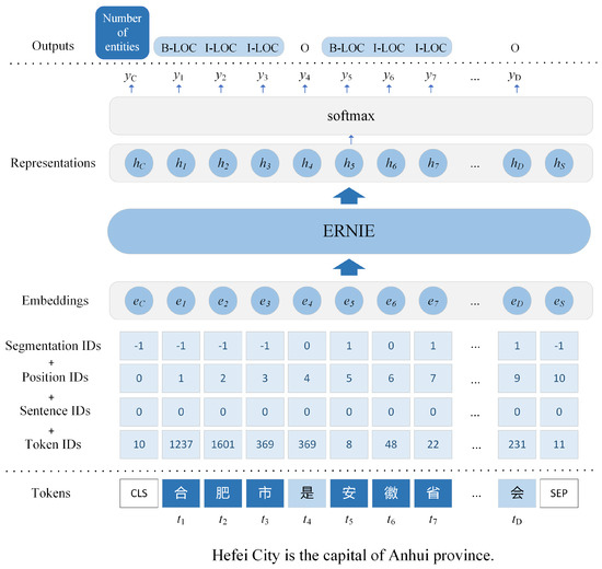 Named Entity Recognition (NER), as the fundamental task of Natural Language Processing (NLP), aims to recognize entities with specific meanings from unstructured text, such as the names of people, locations, and organizations [1]. It is the initial step in extracting valuable knowledge from unstructured text and building a Knowledge Graph (KG). The performance of NER may affect downstream knowledge extraction tasks, such as the Relation Extraction (RE) [2]. In the early years, researchers used rule-based or dictionary-based methods for NER tasks [3,4]. However, these methods lack generalization because they are proposed for particular types of entities. Machine learning and deep learning methods emerging in recent years are also used in NER tasks [5,6]. Nevertheless, the performance of these methods often suffers from small-scale human-labelled training data, resulting in poor generalization capability, especially for rare words. Therefore, it is of interest to know whether the prior semantic knowledge can be learned from large amounts of unlabelled corpora to improve the performance of NER.