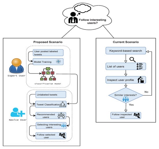 Suppose a user of a micro-blog platform wants to look for other users to follow, in order to receive their posts. How to find them? Currently, both micro-blog apps and the web sites provide a search functionality to search for users on the basis of a keyword-based search. So, the activity a user has to perform to find out interesting users to follow, that is depicted in the right-hand side of Figure 1 (the block titled Current Scenario), can be summarized as follows.