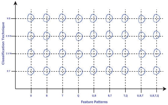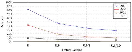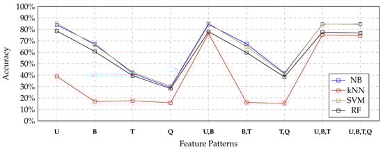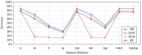 Figure 4 depicts the results obtained by each classifier for all feature patterns by using the full set of features extracted from the training set. The blue line depicts the results obtained by the Naïve Bayes classifier; the red line depicts the results obtained by the kNN classifier; the brown line depicts the results obtained by the SVM classifier, the black line depicts the results obtained by the Random-Forest classifier.