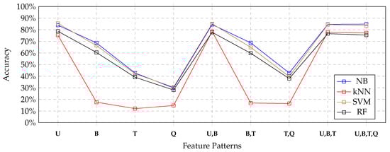 Considering the 65% case (depicted in Figure 6), and the 50% case (depicted i Figure 7), we still observed a very slight reduction of accuracy. Only the kNN classifier behaved significantly worse with uni-gram patterns in the 50% case; nevertheless, looking at Figure 7, we notice that with patterns U,B,T and U,B,T,Q, the combined feature patterns that contained uni-grams helped the classifier to obtain good results.