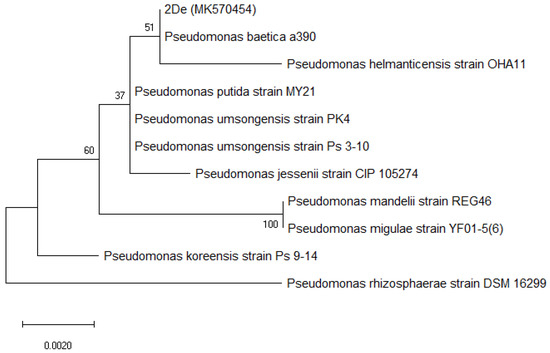 The selected isolate was identified using 16S rRNA analysis. Genomic DNA of the 2De strain was extracted from pure cultures grown from a single colony using a DNA extraction kit (Bacterial and Yeast Genomic DNA Purification Kit, EURx, Gdańsk, Poland) according to the manufacturer’s instructions. The DNA was used as the template with the universal bacterial primers 8F (5′ AGTTTGATCATCGCTCAG 3′) and 1492R (5′ GGTTACCTTGTTACGACTT 3′) targeting a fragment size of 1484 bp [27]. The identity of the obtained sequence was performed using the ClustalW alignment and compared with published sequences using the NCBI BLAST program in the GenBank database. The Average Nucleotide Identity (ANI) calculator [28] was used to determine the similarity of 16S rRNA sequences between tested and typed strains [29]. In order to elucidate the phylogenetic position of the strain, a phylogenetic tree was constructed based on the longest common fragment of the 16S rRNA gene sequence (1372 bp) selected from ClustalW alignment of the 2De strain and the 10 closest type strains of other Pseudomonas species obtained from GenBank. The analysis was performed using Mega X software with the maximum likelihood method and Tamura-3-parameter model, assuming that a certain fraction of sites are evolutionary invariable (þI) and 1000 bootstrap replicates [30,31].
