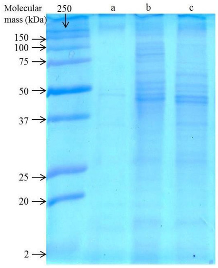 The total protein content of the 2De strain was found to be 29.97 mg mL−1 for cells cultivated in the presence of 0.5 mM MnO2, 28.30 mg mL−1 when bacteria were cultivated in the presence of the soil, and 31.34 mg mL−1 for control cells. To analyze the effect of a high level of Mn on the protein profiles of the isolated bacterial strain, SDS/PAGE of the whole cell lysate was carried out (Figure 2).