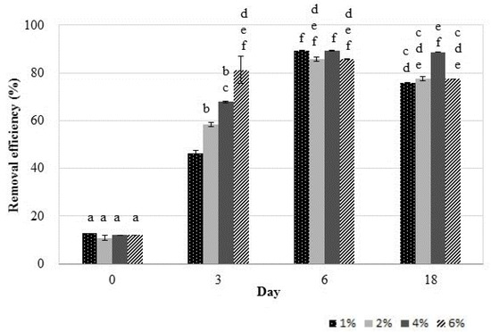 The potential of the 2De strain to reduce the Mn concentration was investigated. During this process, bacteria can remove metals from soil by both bioaccumulation and biosorption [39]. It was reported that living cells have a greater capacity for metal removal than non-living cells [40]; therefore, live bacterial cells were used in the experiment. The pH value and surface tension were carefully controlled over the entire period of bacteria cell and soil contact. When soil concentration increased from 1% to 6%, Mn removal efficiency increased from 46% to 81% after three days of incubation (Figure 3). After six days, the Mn removal efficiencies in all research samples were comparable and were within the range of 85–89%. At the end of the experiment, the highest Mn removal (88%) was recorded in the set containing soil at a concentration (w/v) of 4%, but it was not significantly higher compared to the sets enriched in 2% and 6% (w/v) soil.