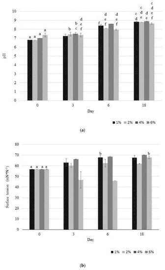 Variation in pH (a) and in surface tension (b) leachate observed during the accumulation study of Mn by the 2De strain using different soil concentration from the metallurgical waste. The same letter indicates no significant differences among groups (LSD, p < 0.05). Error bars are standard deviation (n = 3).