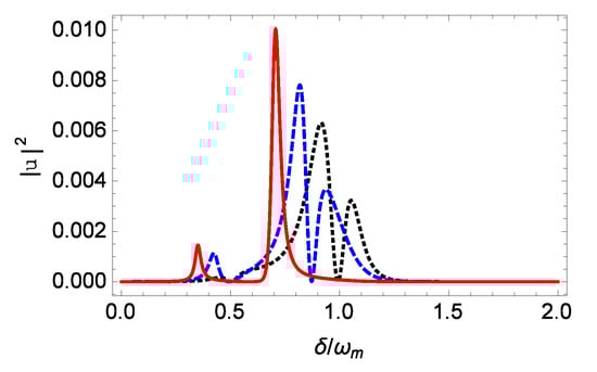 The intensity of the second-order upper sideband generation in the output field versus the normalized probe detuning for different values of the nonlinearity strength N/m when . The other parameters are the same as those in Figure 2. The black dotted, blue dashed, and red solid lines correspond to , N/m, N/m, respectively. Here, the red solid line for N/m has been divided by 10.