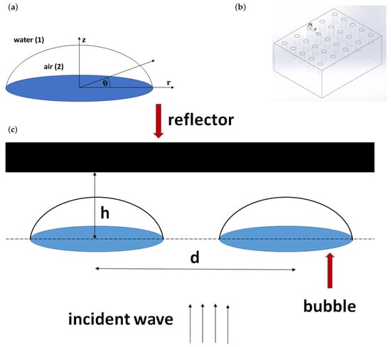 Introduce cylindrical coordinate system () with the origin at the bubble center and consider vertical displacement of the bubble surface (along z axis). The schematic of a single bubble is given in Figure 1a. The geometry of the cavity array for bubble entrapment is shown in Figure 1b. All of the bubbles in the array are assumed to be identical and ordered. Figure 1c shows the system geometry with reflector adjacent to bubble array.