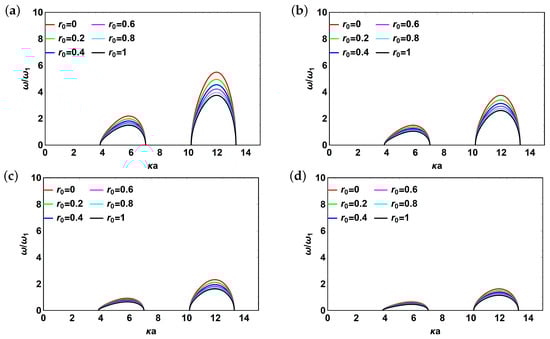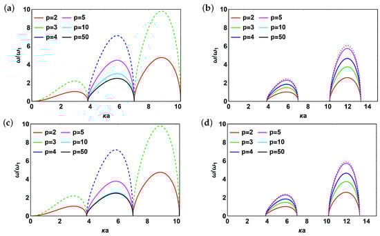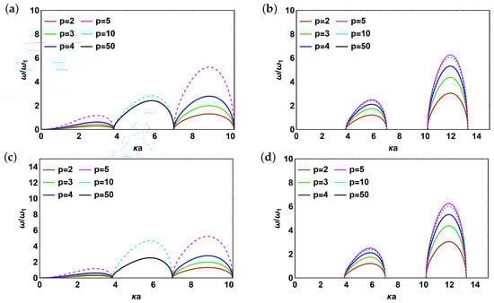 Now, let us examine dispersion relations for all of the frequencies obtained above. Introduce non-dimensional quantities and for convenience and consider the behavior of modes normalized by mode . The case of 1 interface without reflector is shown in Figure 2. Figure 2a represents the case without interface and without reflector (given by Equation (18)) and it is provided for reference. Figure 2b,d correspond to from Equation (24) and from Equation (22). The plots look pretty similar due to relatively low value of dissipation factor () and demonstrate the presence of bandgaps while the values of the resonant peaks increase with increasing p until hardly recognizable maximum (compare and ) and then reaches saturation. Large values of p correspond to the case of independent scatterers. Finally, Figure 2c corresponds to from Equation (22). The behavior of dispersion curve changes dramatically as p increases from to . More specifically switching between the modes happens. Hereafter, under “switching” between modes we understand changing dispersion curve position along horizontal axis that corresponds to a different value of . Moreover, the value of the resonant peak increases before mode switching and starts to decrease after it.