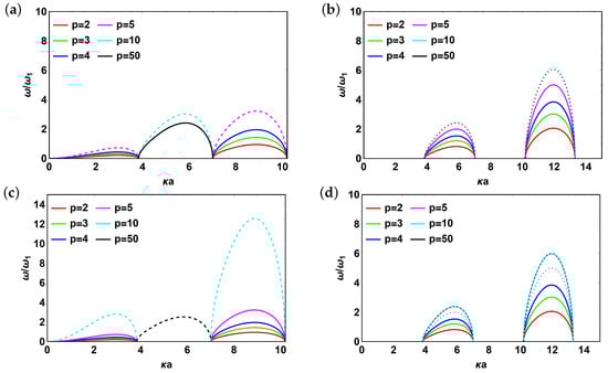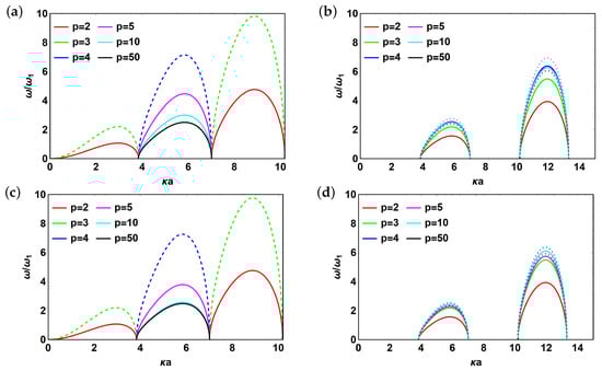 Normalized frequency as a function of p (distance between bubble centers) for metascreen (a) w/2 interfaces and w/o reflector, “positive” branch, ; (b) w/2 interfaces and w/o reflector, “negative” branch, ; (c) w/2 interfaces and w/reflector (), “positive” branch, ; (d) w/2 interfaces and w/reflector (), “negative” branch, .