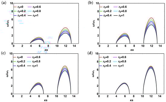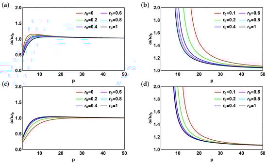 Finally, consider the case of varying reflection coefficient, . It is shown in Figure 10. Here, we fix (lowest possible value) and examine the behavior of normalized frequency of the system with p. In Figure 10a,c the “positive” branch of the solution is presented without (Figure 10a) and with dissipation (Figure 10c). The trend is overall repeatable with normalized frequency reaching saturation for large p. The dramatic difference is that for small dissipation the rate of reaching saturation decreases with increasing whereas it increases with increasing when dissipation is taken into account. For “negative” branch of the solution (Figure 10b,d) the trend is almost the same: abrupt decrease of normalized frequency with increasing p. However, the starting point of abrupt decay moves to lower values of p with increasing , opposite to the trend observed in Figure 8d.