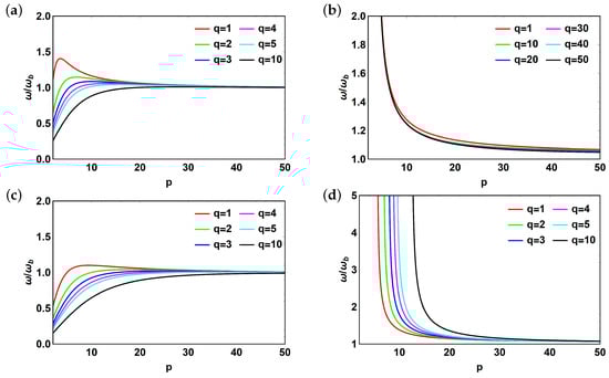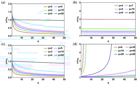 Figure 9 shows the dependence of normalized system frequency as a function of q. Similar to above, we consider the case with two interfaces with and without reflector. For “positive” branch of the solution (Figure 9a) the presence of reflector (Figure 9c) does not effect the behavior of the system. The normalized frequency decreases monotonically with increasing q and tends to 1 with increasing p. However, the situation changes for “negative” branch of the solution. If the reflector is absent (Figure 9b) the normalized frequency does not change with q and decreases with increasing p. If the reflector is present (Figure 9d), the normalized frequency increases abruptly with increasing q. However, the trend becomes more moderate with increasing p until it becomes independent of q for large values of p.