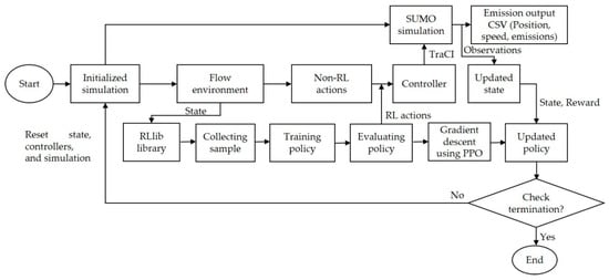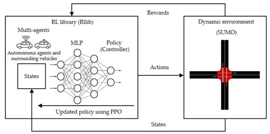 In this study, we applied the open-source modular learning framework Flow to connect the RL library (RLlib) to the traffic simulator (SUMO). Flow allows us to simulate varied and complex traffic environments, multiple agents, and multiple algorithms []. The implementation is based on SUMO [], Ray RLlib for RL [], and the OpenAI gym for the MDP []. Our study focuses on an online optimization in a closed-loop setting through deep RL. Figure 2 shows the proposed method’s architecture.
