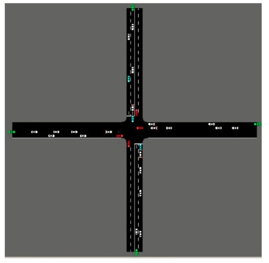 SUMO, developed by the Institute of Transportation Systems at the German Aerospace Center, is an open-source microscopic traffic simulator. SUMO can simulate urban-scale traffic networks along with traffic lights, vehicles, pedestrians, and public transportation. In addition, the TraCI enables SUMO to be connected to Python in order to apply deep RL to the SUMO simulator. A typical SUMO simulator at a non-signalized intersection is shown in Figure 3.